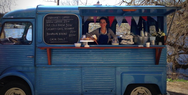 So she bought Frankie, shipped him and herself off to Stockholm and opened up a mobile coffee shop.