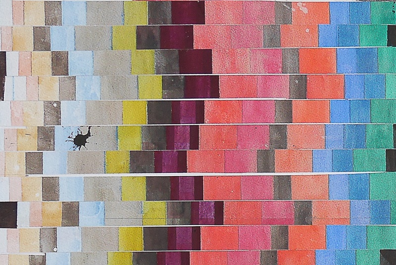 Inspired by her mother’s textile crafts where stripes often occurred in weavings, Britta Kjellgren Jäger chooses watercolour on paper to make the textiles’ parallel stripes and their tactile sensual shapes and colours even more apparent; cutting up her large watercolors and systematically stitching the literally roughly mangled stripe after stripe of similar widths and heights of stiff watercolor paper back together into totally new constellations of works.