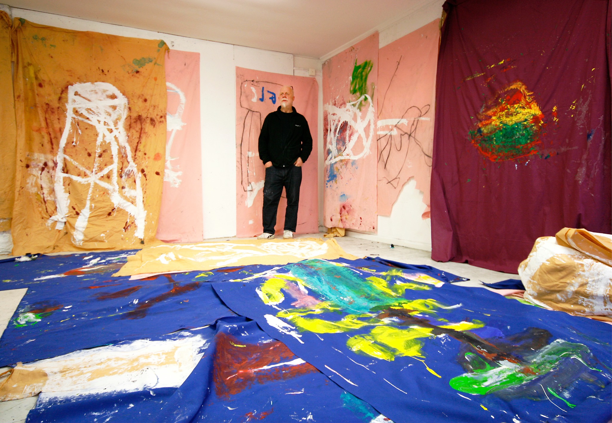 Ingvarsson’s artistic work stem from curiosity and an exploration of painting as a media, but also of the material that he works on. In the exhibition at Galerie Forsblom in Stockholm, Ingvarsson has painted on different kinds of textiles; sheets, fiber cloths, sun-blinds and more. Liberated from the traditional stretched and framed canvas, Ingvarsson’s paintings are unobstructed. With lightness he moves freely between figurative expressionism and abstraction.